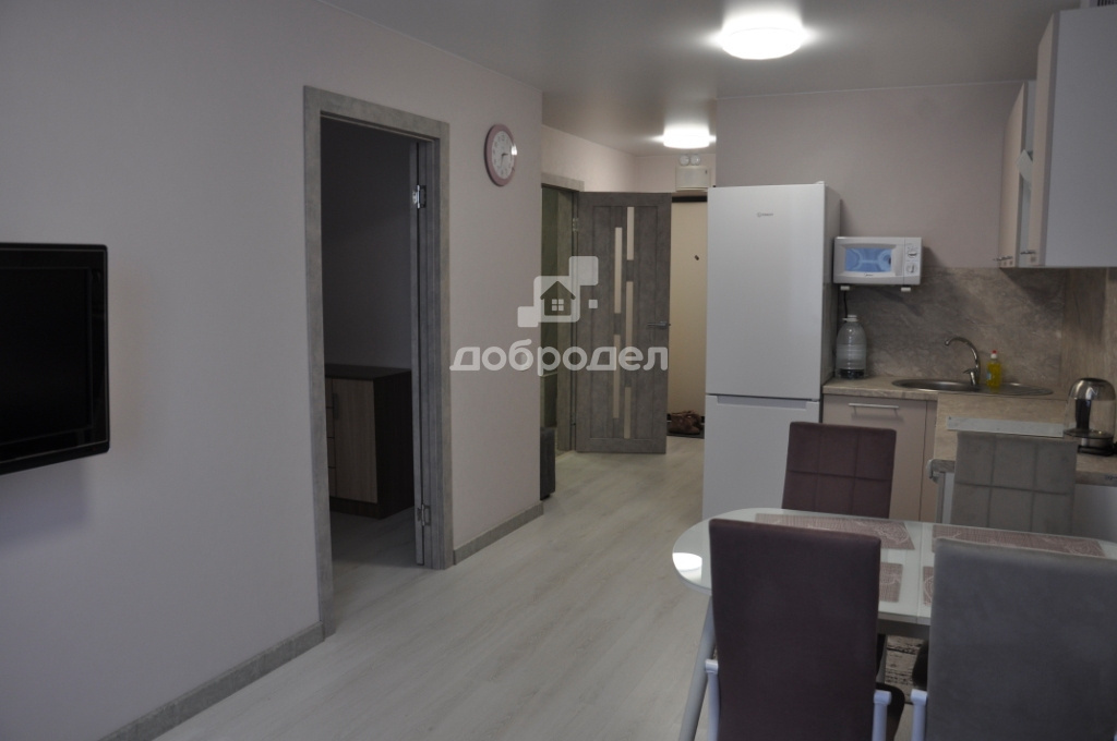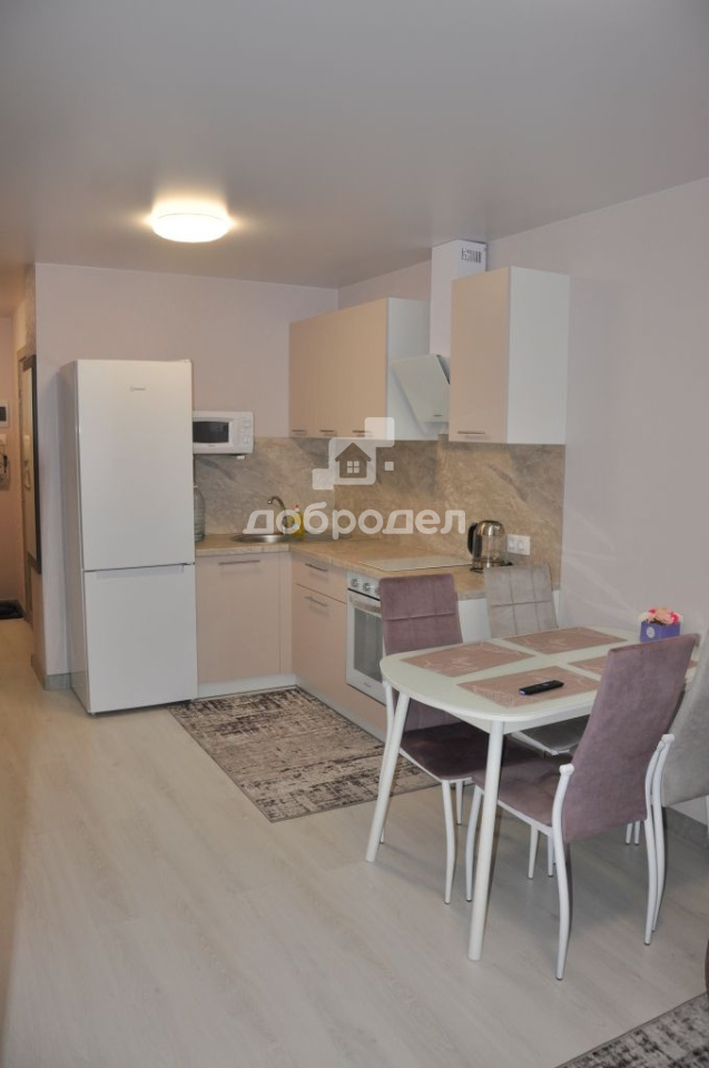 Есть вся необходимая мебель и техника: вместительная гардеробная-постирочная, там установлена стиральная машинка и хранится мелкая бытовая техника: пылесос, утюг и т.п., на кухне раскладывающийся диван, кухонный гарнитур со встроенным духовым шкафом и варочной поверхностью, холодильник, вытяжка, микроволновка, обеденный стол, телевизор! В комнате диван-кровать и комод!