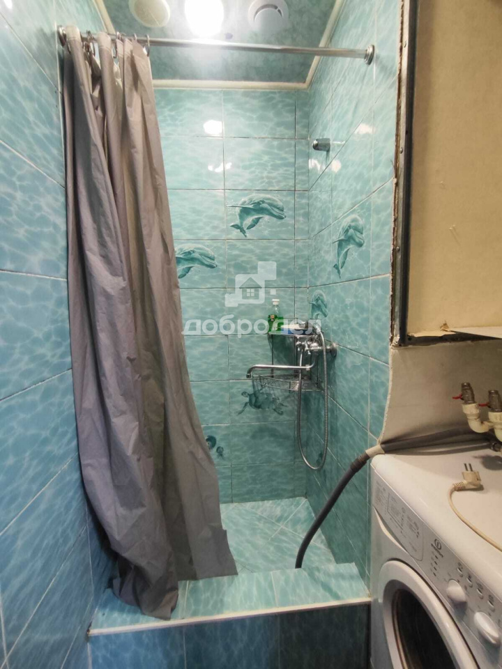 В комнате есть шкаф-купе, раскладной диван, стол, стиральная машина.