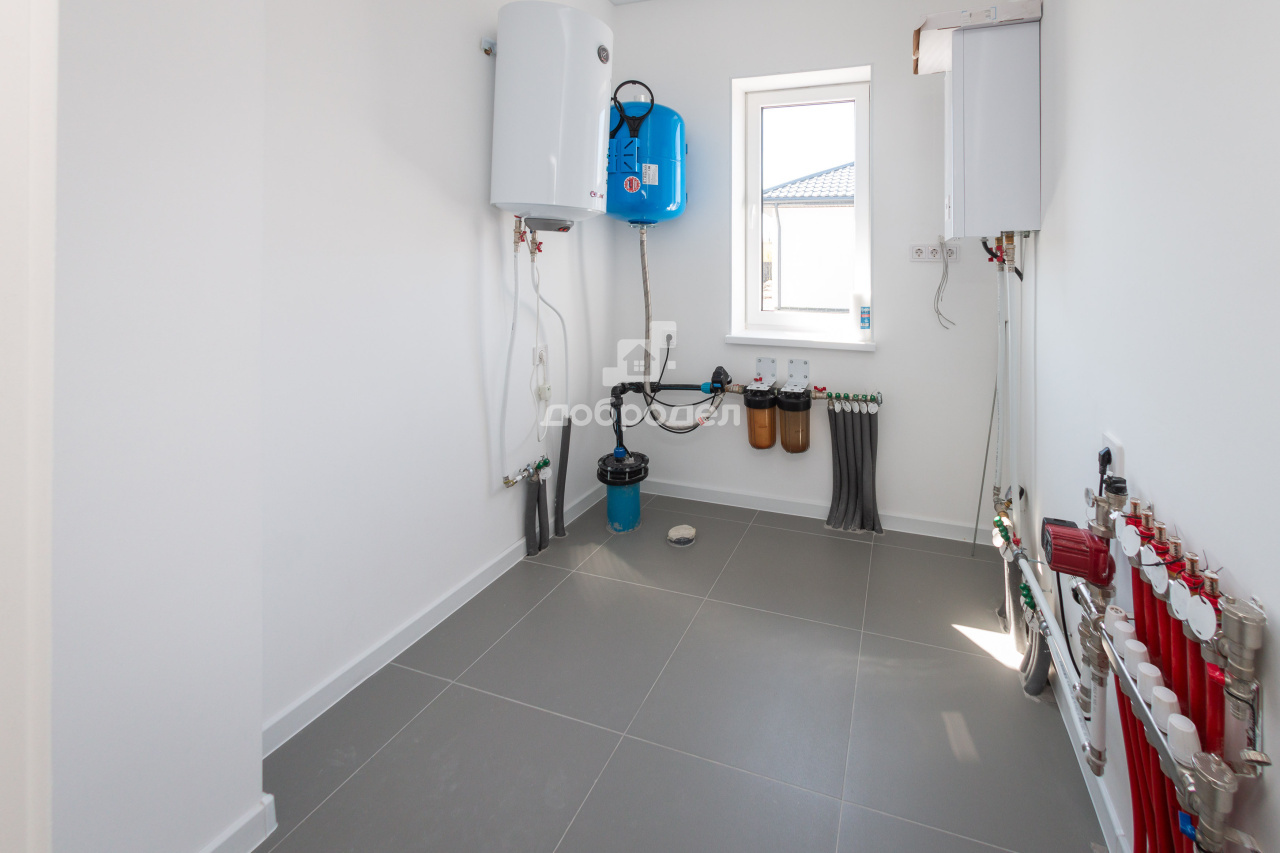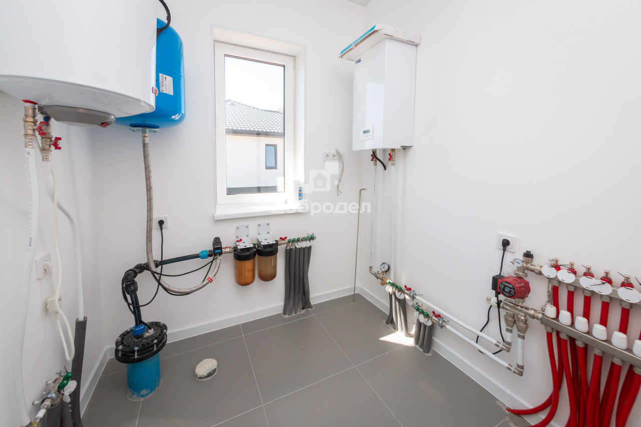 Электрическая разводка по всем помещениям с выводами под розетки, приборы освещения. Отопление: система водяных тёплый полов + радиаторы; электрический котел 18 кВт; водонагреватель 100 л. Водоснабжение: собственная скважина с артезианской водой насосом и гидроаккумулятором. Водоотведение выполнено в локальный септик.