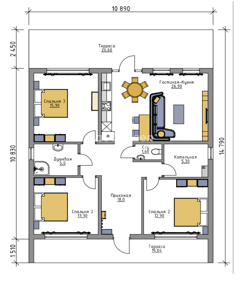 2025 года постройки, каменный, подходит для круглогодичного проживания. Скважина, септик! Отделка "под ключ"! Удобная планировка: 3 изолированных спальни, просторная кухня-гостиная с выходом на террасу, вместительная ванная комната с окном, гостевой санузел (или кладовка), отдельное помещение котельной, можно использовать как постирочную.