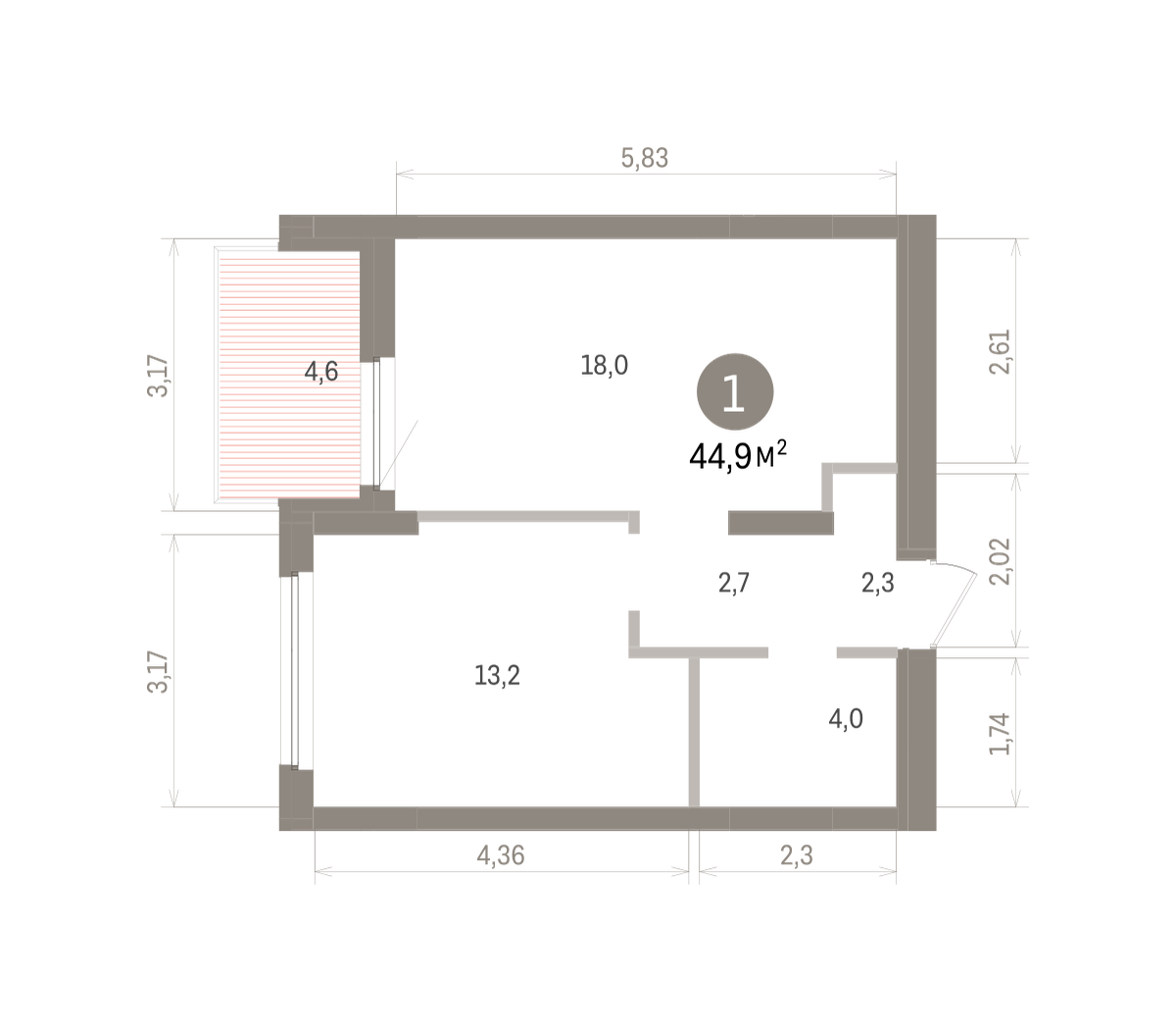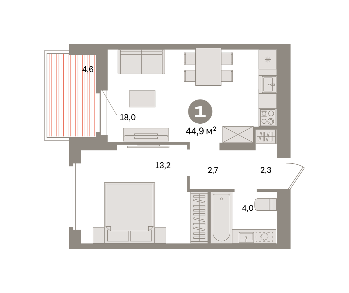 Квартира с кухней-гостиной и одной спальней в квартале «Депо». Особенности планировки: балкон, предчистовая отделка. № квартиры в нашей базе: ДЕП07-Ж1.14.5.