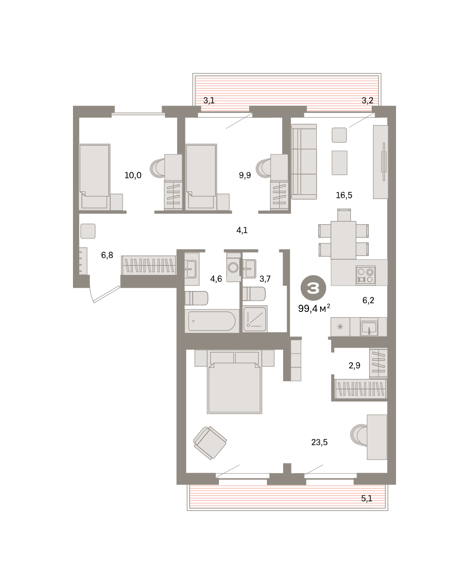 3-к квартира | 90.00 м² | 3 - 21 эт.