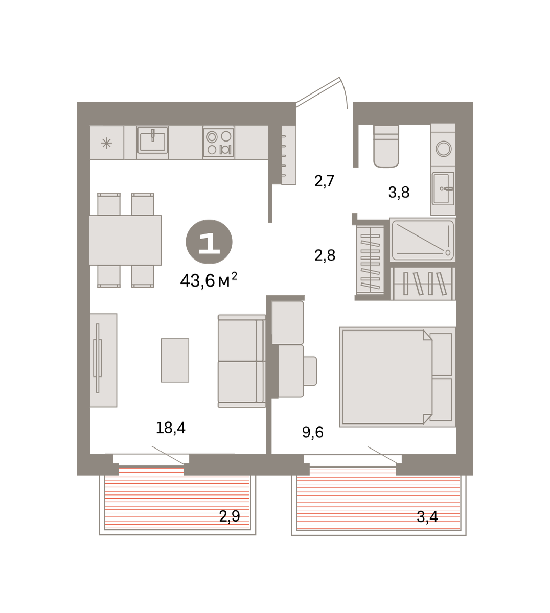 Квартира с кухней-гостиной и одной спальней в квартале «Депо». Особенности планировки: балкон, предчистовая отделка. № квартиры в нашей базе: ДЕП04-Ж6.3.4.