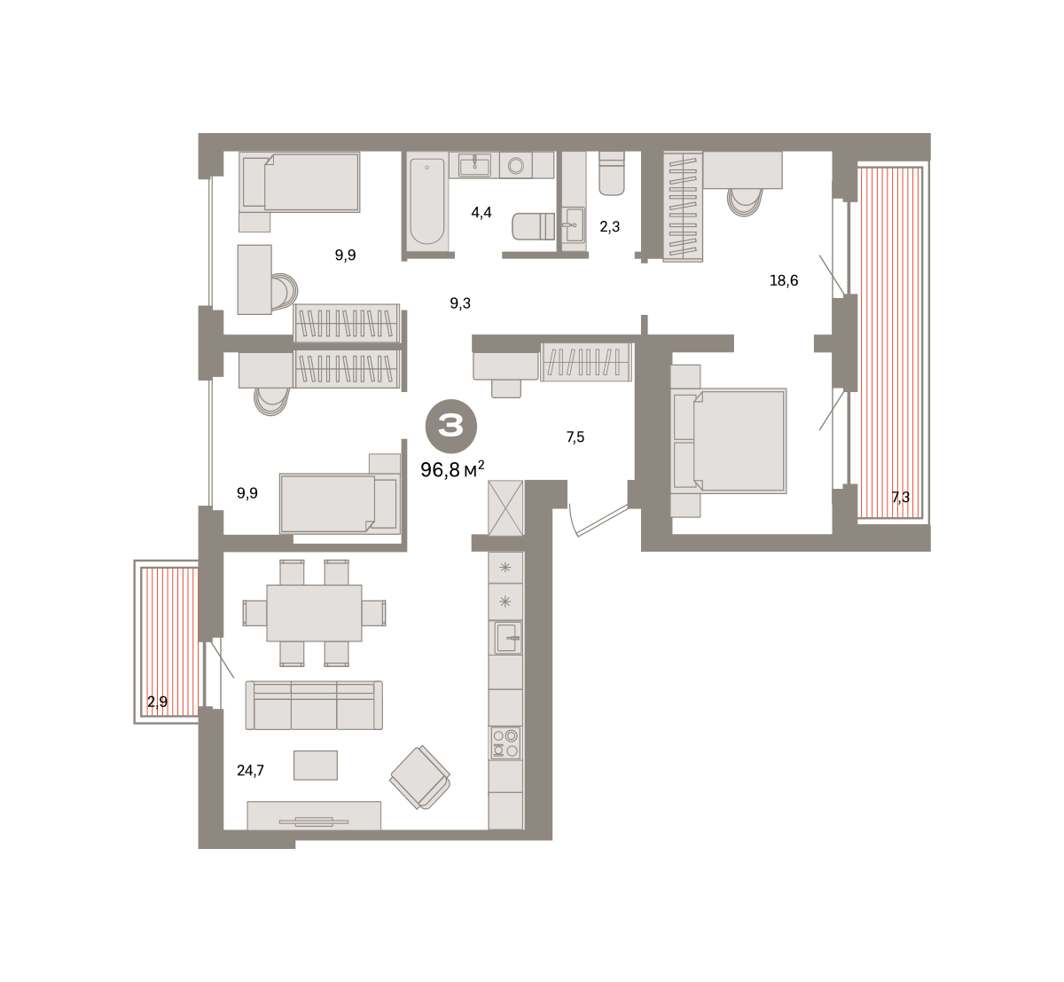Продаётся с кладовой. Квартира с кухней-гостиной и тремя спальнями в квартале «Депо». Особенности планировки: балкон, окна на две стороны, предчистовая отделка, разнесённые спальни, терраса на крыше. № квартиры в нашей базе: ДЕП04-Ж5.9.1.