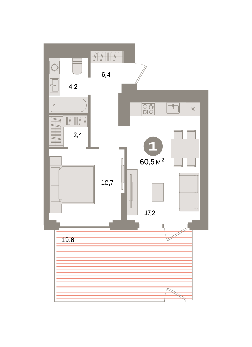 Продаётся с кладовой. Квартира с кухней-гостиной и одной спальней в квартале «Депо». Особенности планировки: вид во двор, гардеробная, предчистовая отделка, терраса. № квартиры в нашей базе: ДЕП04-Ж2.1.1.
