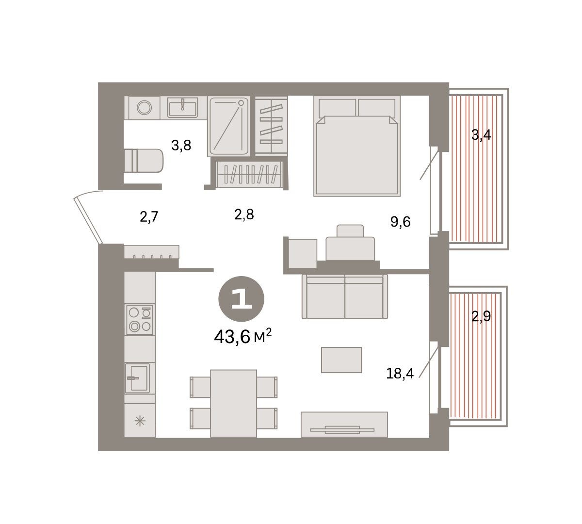 Квартира с кухней-гостиной и одной спальней в квартале «Депо». Особенности планировки: балкон, предчистовая отделка. № квартиры в нашей базе: ДЕП04-Ж4.3.7.