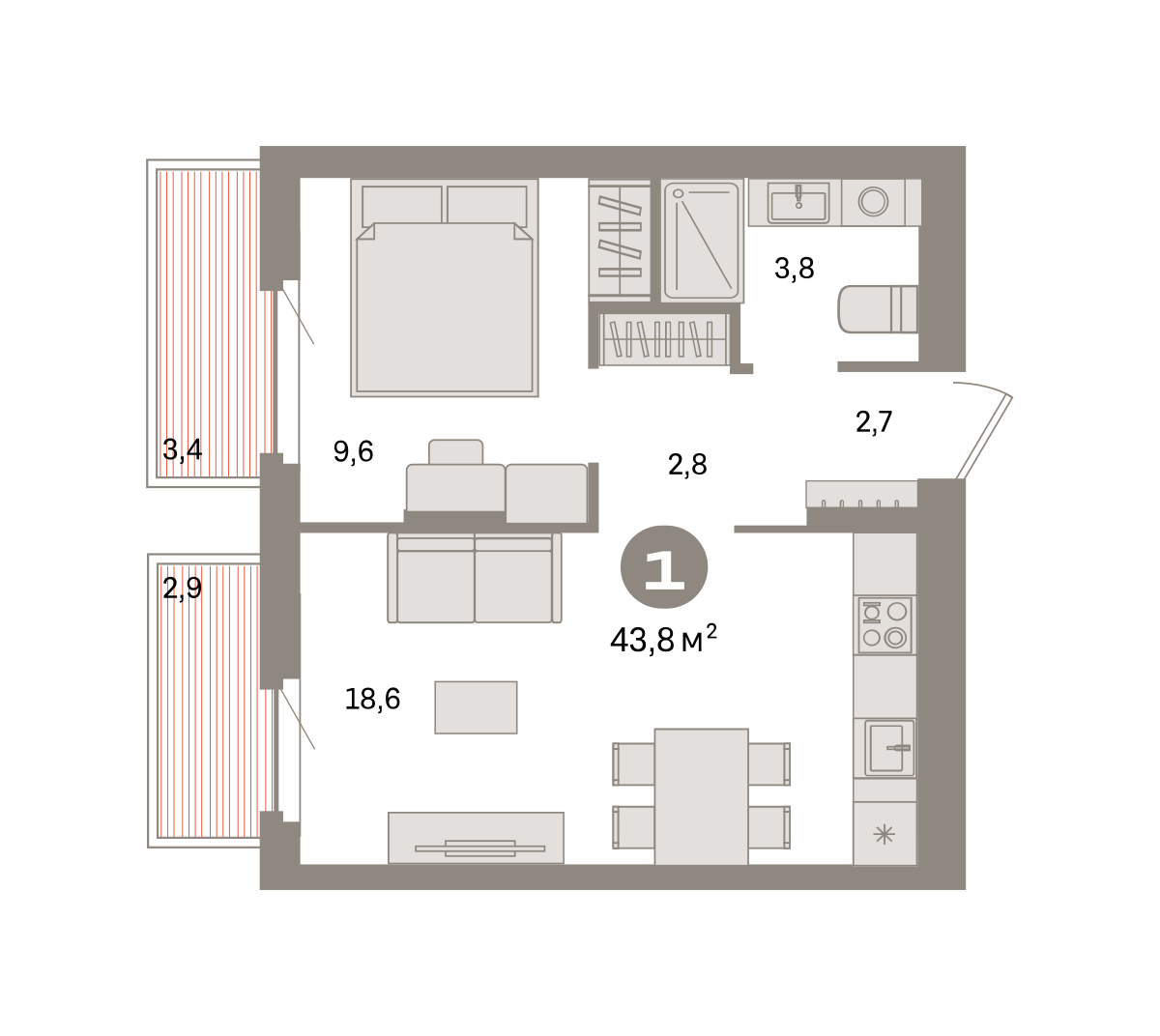 43.00 м² | 6 - 9 эт.
