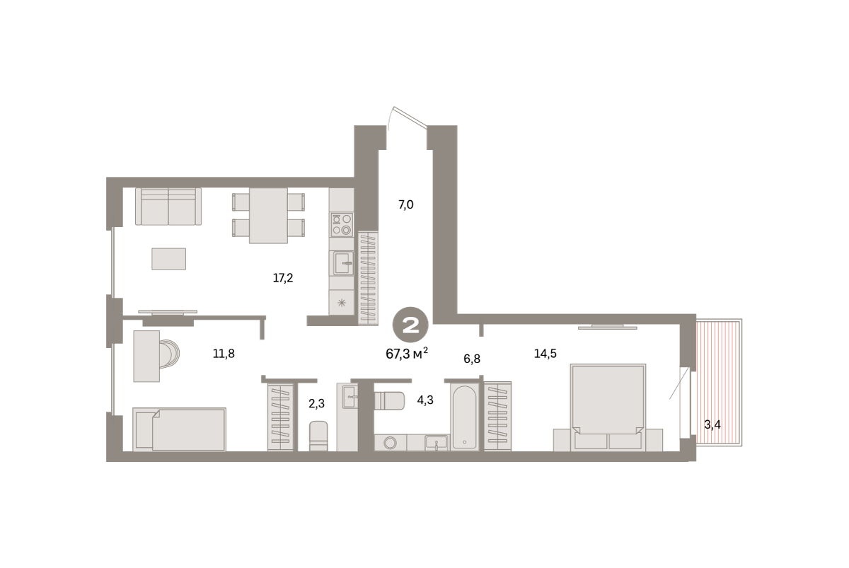 Квартира с кухней-гостиной и двумя спальнями в квартале «Депо». Особенности планировки: балкон, окна на две стороны, предчистовая отделка, разнесённые спальни. № квартиры в нашей базе: ДЕП04-Ж1.5.3.