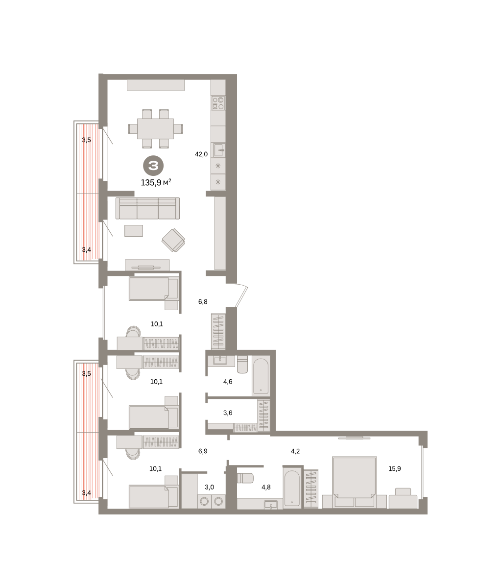 Квартира с кухней-гостиной и четырьмя спальнями в квартале «Депо». Особенности планировки: балкон, окна на две стороны, предчистовая отделка, рабочий кабинет, разнесённые спальни. № квартиры в нашей базе: ДЕП04-Ж4.3.8.