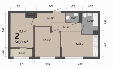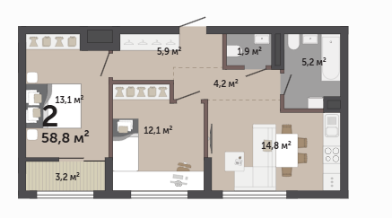 58.80 м² | 9 - 17 эт.
