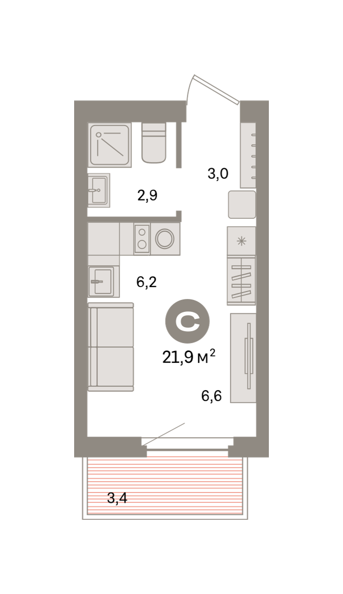 Студия в квартале «Депо». Особенности планировки: балкон, предчистовая отделка. № квартиры в нашей базе: ДЕП07-Ж5.3.3.