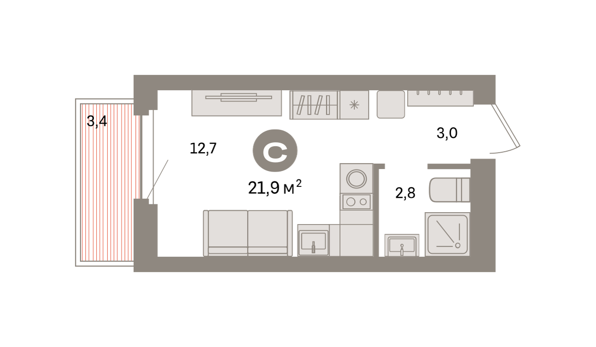 Студия в квартале «Депо». Особенности планировки: балкон, предчистовая отделка. № квартиры в нашей базе: ДЕП04-Ж8.4.6.