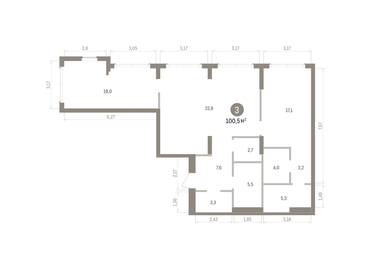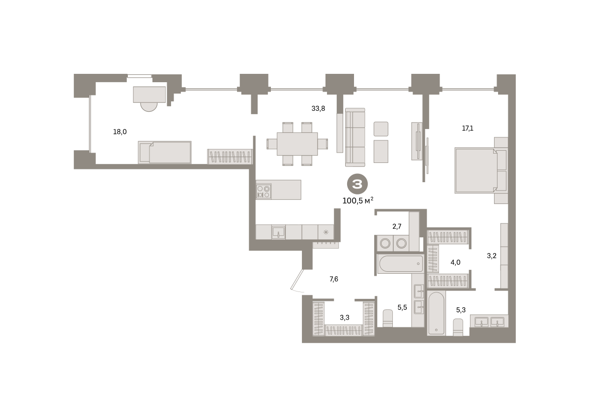 Квартира с кухней-гостиной и двумя спальнями в квартале «Депо». Особенности планировки: предчистовая отделка, разнесённые спальни. № квартиры в нашей базе: ДЕП07-Ж1.2.6.