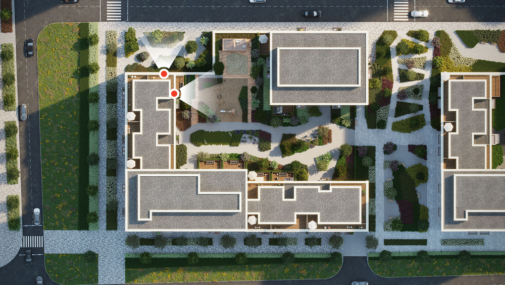 Квартира с кухней-гостиной и двумя спальнями в районе Шишимская горка. Особенности планировки: окна в пол, вид во двор, панорамное остекление, разнесённые спальни, предчистовая отделка, мастер-спальня, терраса.