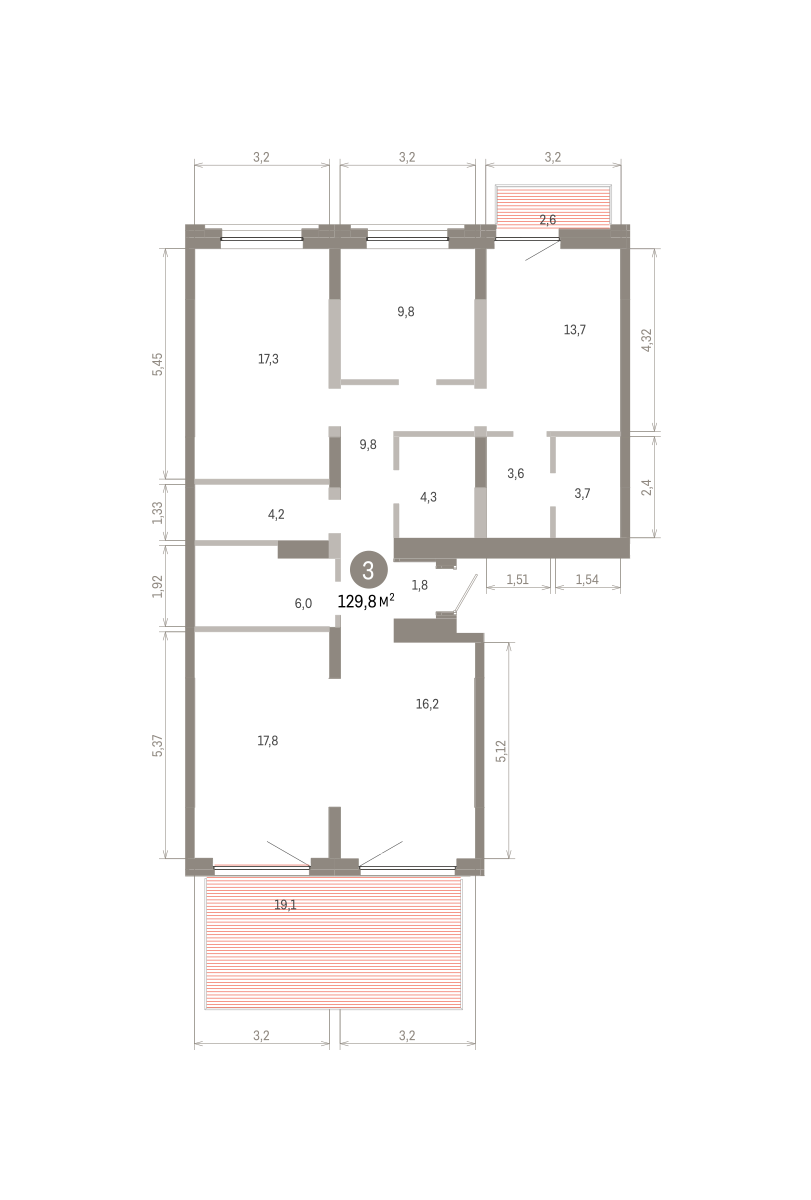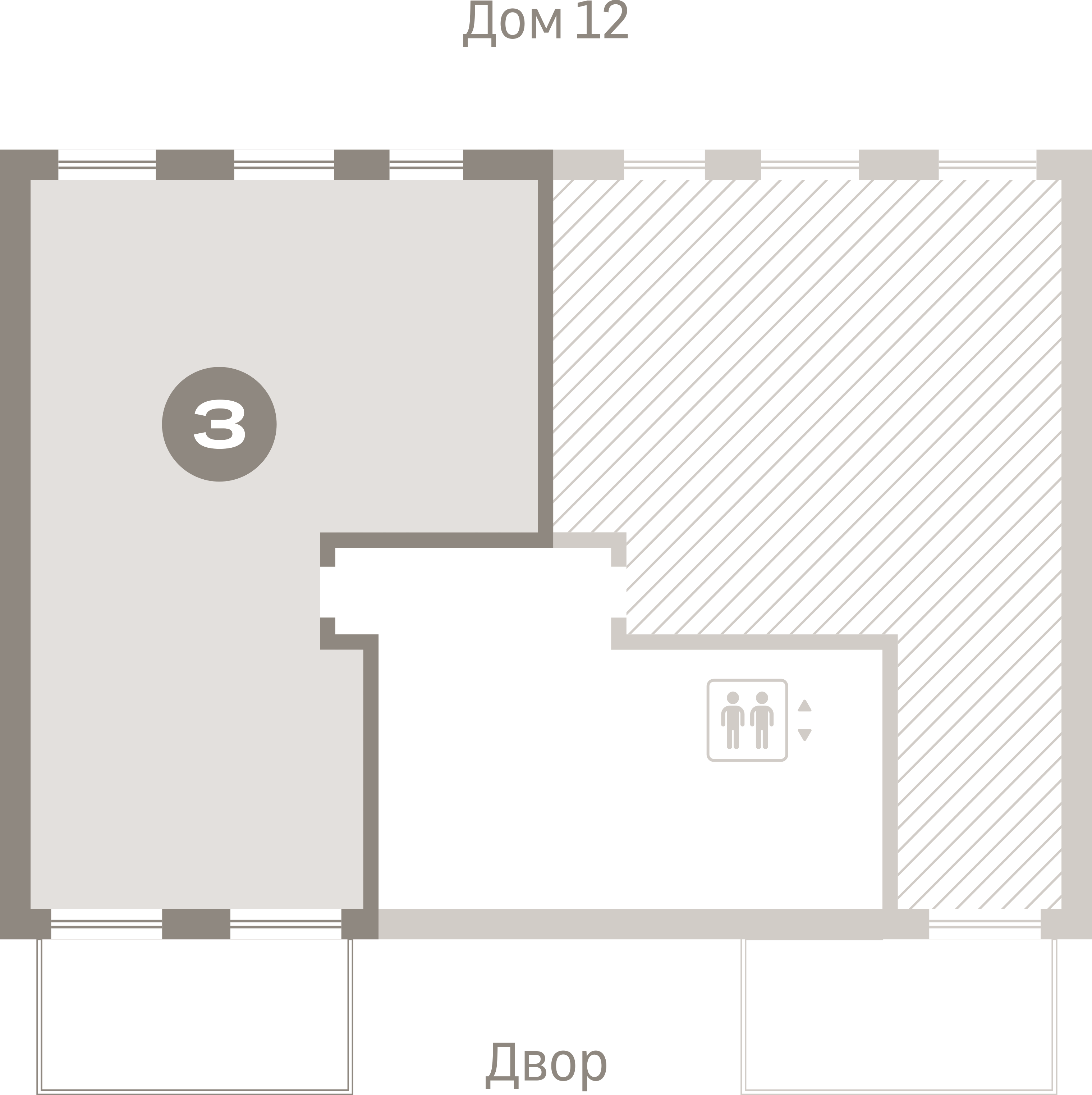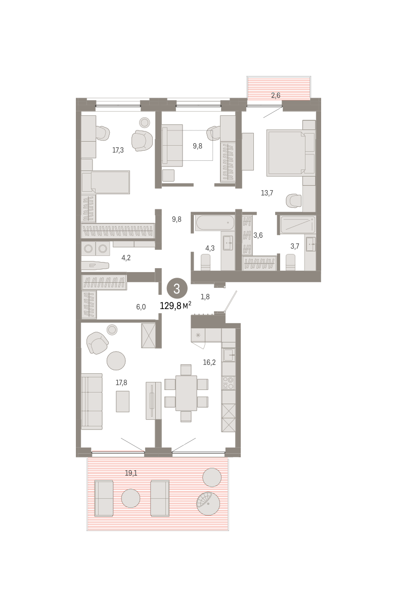Квартира с кухней-гостиной и тремя спальнями в Южных кварталах. Особенности планировки: окна на две стороны, гардеробная, рабочий кабинет, вид во двор, разнесённые спальни, предчистовая отделка, мастер-спальня, терраса, постирочная, балкон.