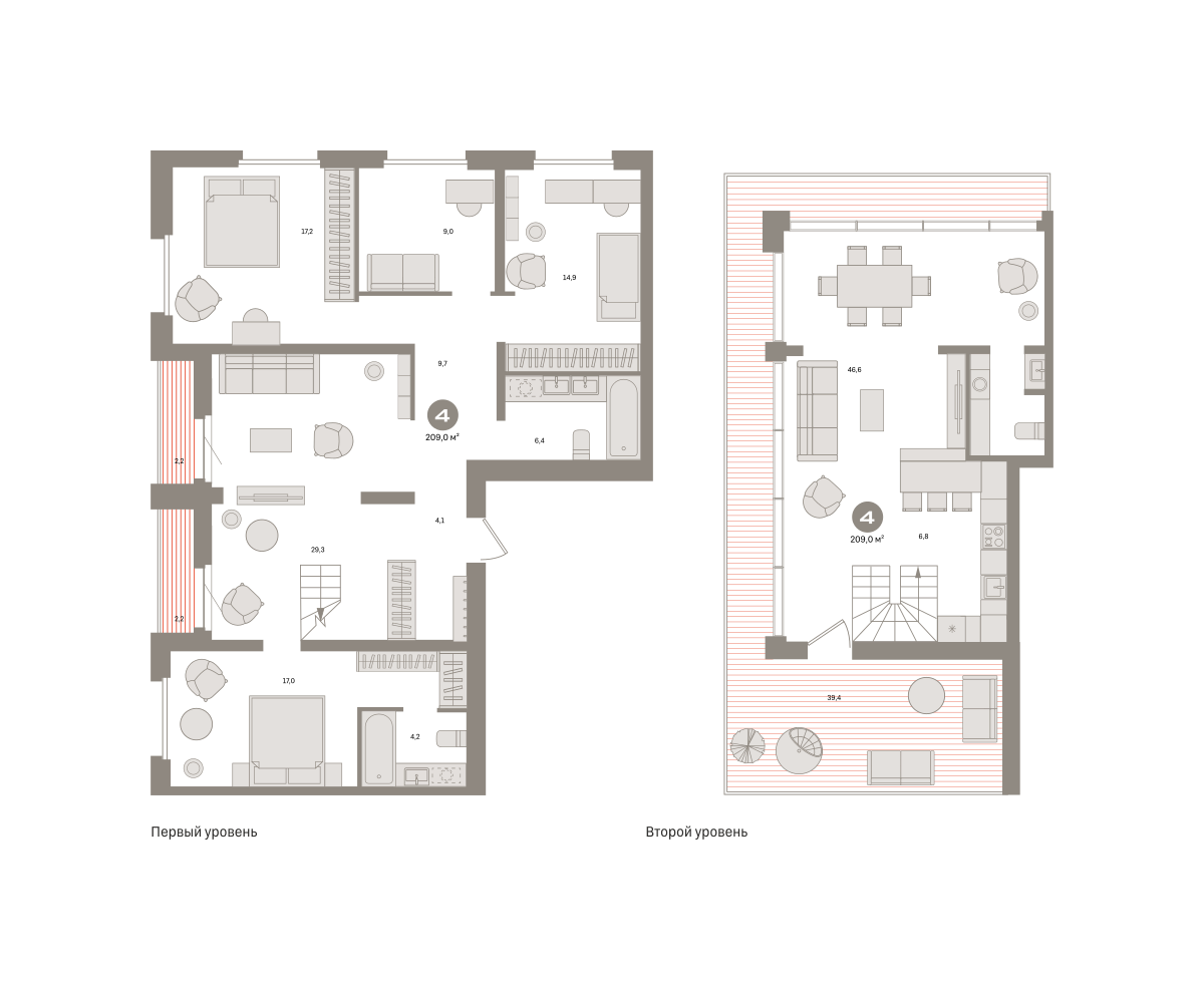 Квартира с кухней-гостиной и четырьмя спальнями в Южных кварталах. Особенности планировки: лоджия, разнесённые спальни, предчистовая отделка, мастер-спальня, летняя кухня на крыше, терраса на крыше.