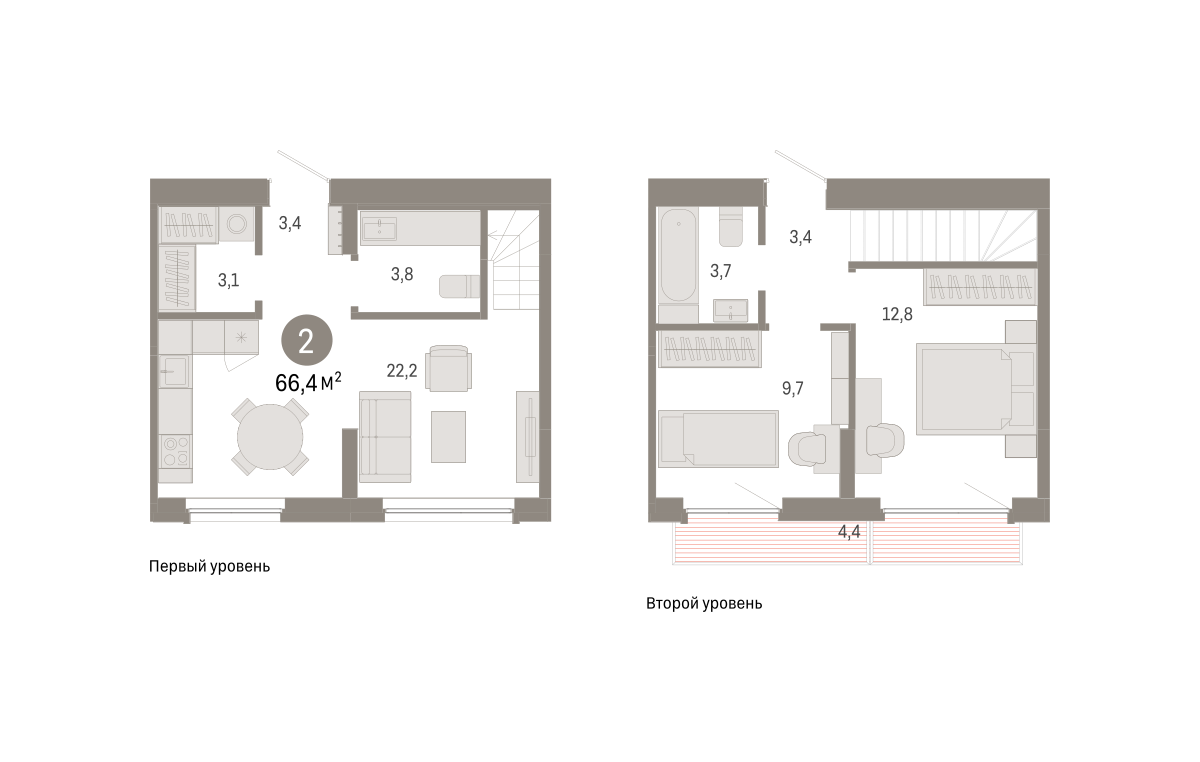 Двухуровневая квартира с кухней-гостиной и двумя спальнями в Бруснике в Академическом. Особенности планировки: второй санузел, двухуровневая, вид во двор, разнесённые спальни, предчистовая отделка, постирочная, балкон.
