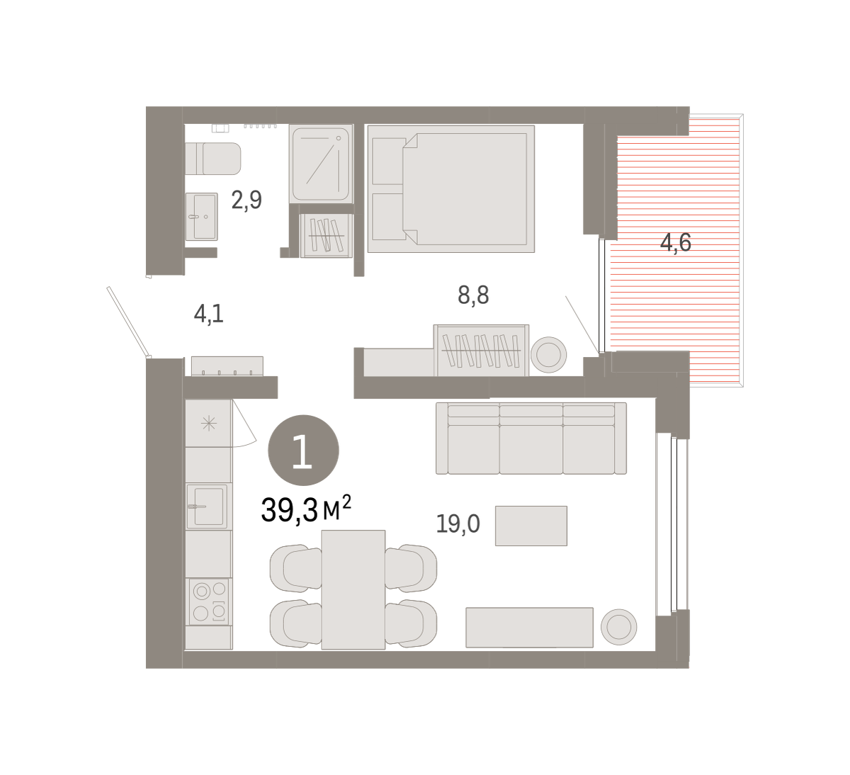 Квартира с кухней-гостиной и одной спальней в Бруснике в Академическом. Особенности планировки: балкон, предчистовая отделка. № квартиры в нашей базе: АКД04-Ж1.9.4.