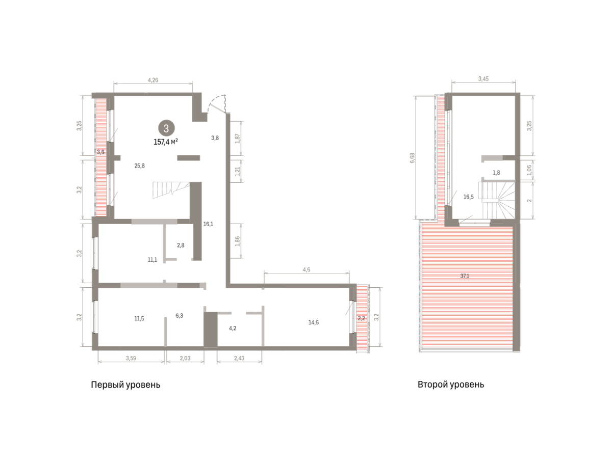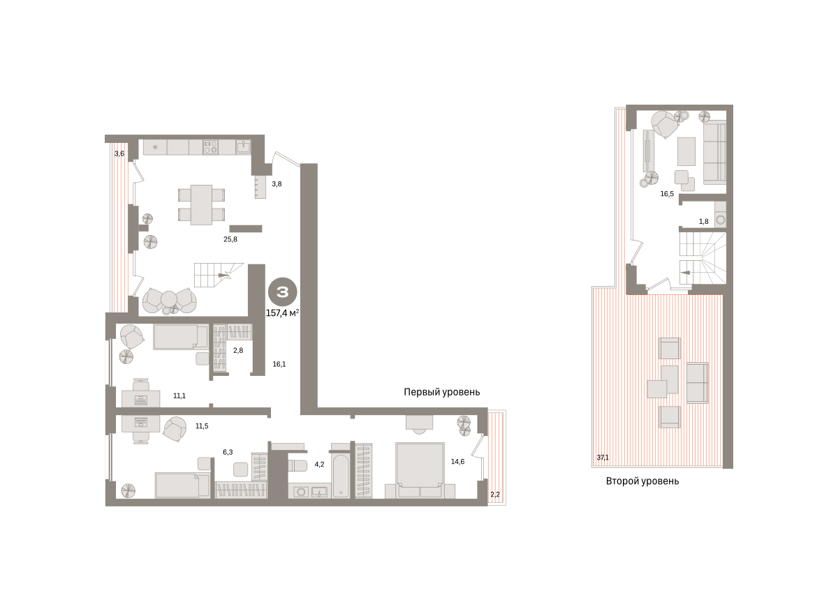 Двухуровневая квартира с кухней-гостиной и тремя спальнями в Южных кварталах. Особенности планировки: вид во двор, гардеробная, двухуровневая, постирочная, предчистовая отделка, разнесённые спальни, терраса, терраса на крыше.