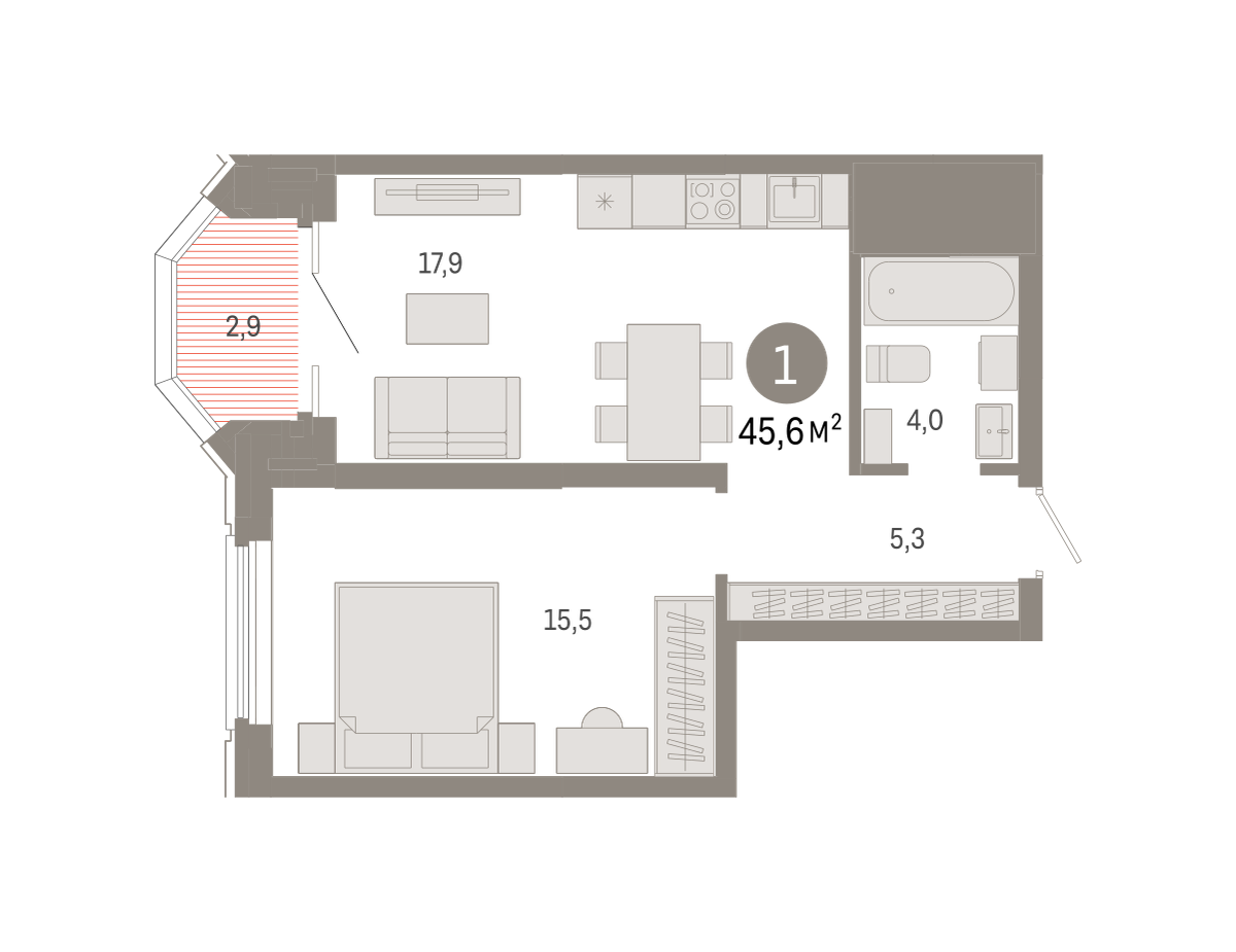 Продаётся с кладовой. Квартира с кухней-гостиной и одной спальней в квартале «На Некрасова». Особенности планировки: лоджия, предчистовая отделка. № квартиры в нашей базе: НКР02-Ж1.10.3.