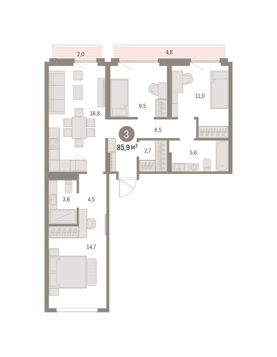 Квартира с кухней-гостиной и тремя спальнями в Бруснике в Академическом. Особенности планировки: окна на две стороны, гардеробная, вид во двор, разнесённые спальни, предчистовая отделка, мастер-спальня, балкон.