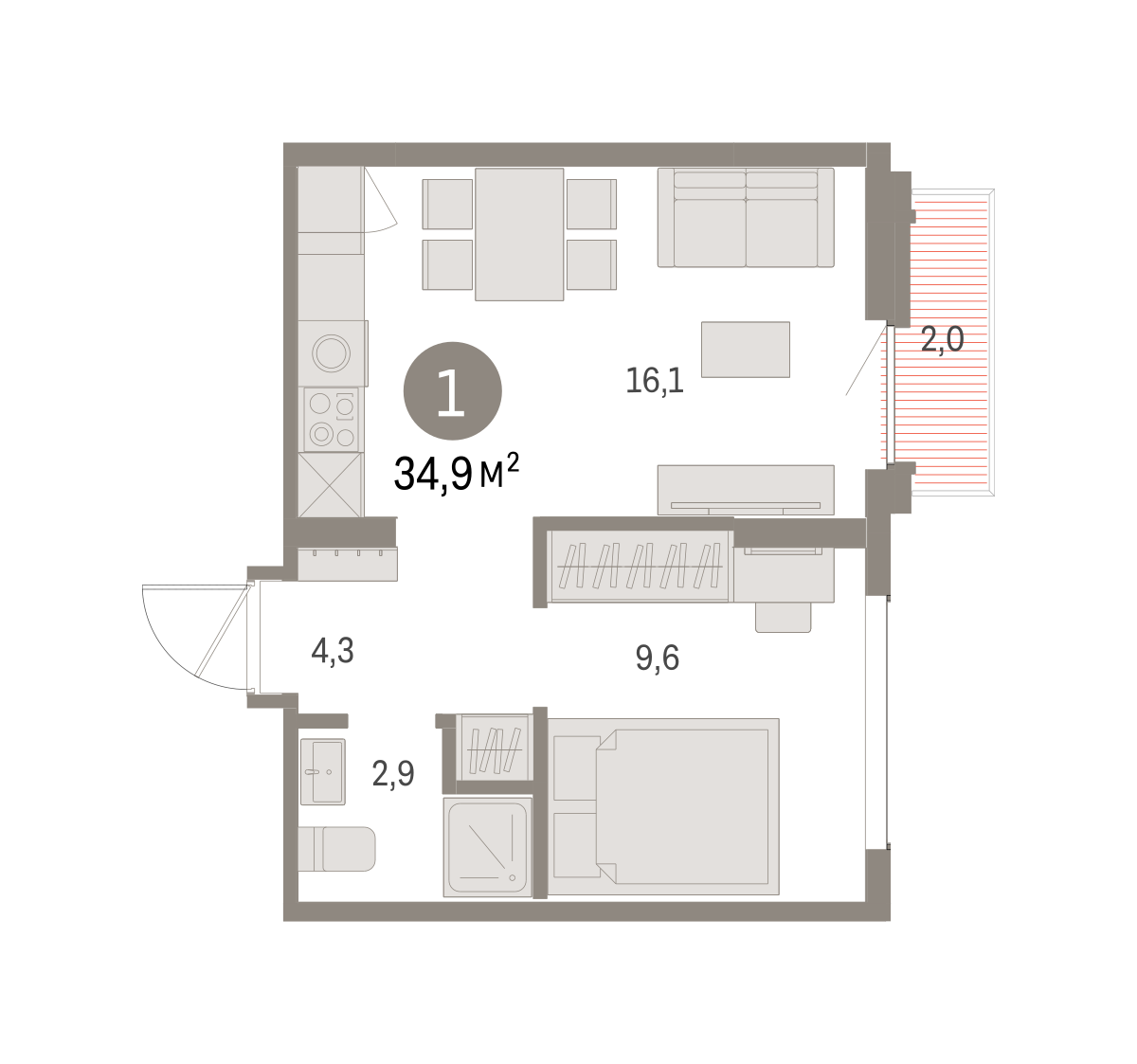 Квартира с кухней-гостиной и одной спальней в Бруснике в Академическом. Особенности планировки: вид во двор, предчистовая отделка, балкон. № квартиры в нашей базе: АКД05-Ж8.9.7.