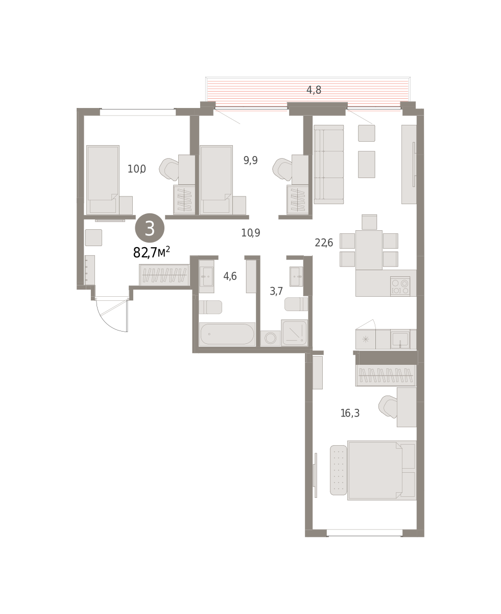 Продаётся с кладовой. Квартира с кухней-гостиной и тремя спальнями в Бруснике в Академическом. Особенности планировки: окна на две стороны, второй санузел, разнесённые спальни, предчистовая отделка, балкон. № квартиры в нашей базе: АКД05-Ж6.8.1.