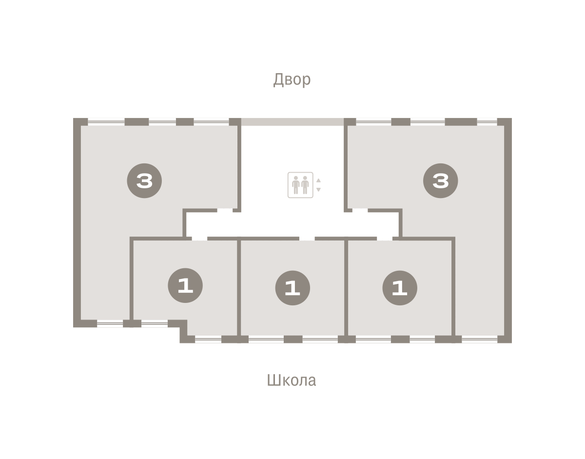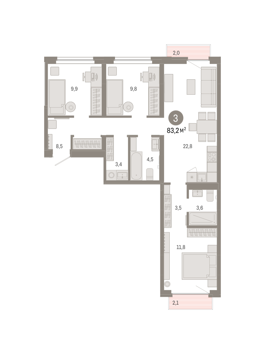 Квартира с кухней-гостиной и тремя спальнями в Бруснике в Академическом. Особенности планировки: второй санузел, гардеробная, вид во двор, разнесённые спальни, предчистовая отделка, мастер-спальня, постирочная, балкон.