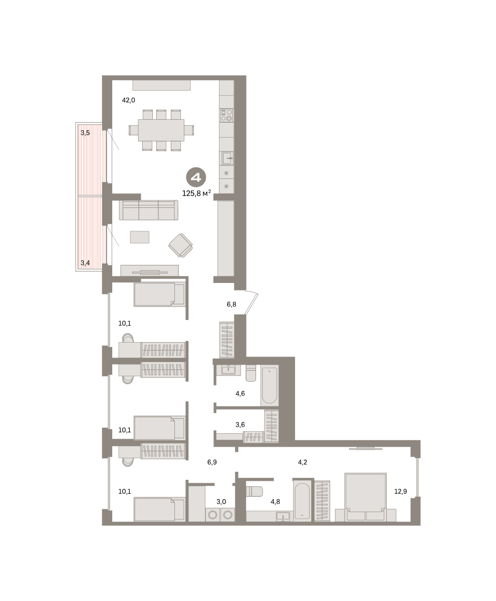 Квартира с кухней-гостиной и четырьмя спальнями в квартале «Депо». Особенности планировки: окна на две стороны, гардеробная, вид во двор, разнесённые спальни, предчистовая отделка, мастер-спальня, постирочная, балкон.