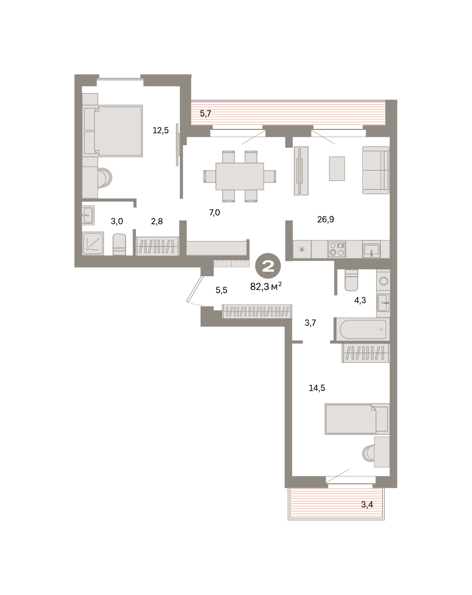 Квартира с кухней-гостиной и двумя спальнями в квартале «Депо». Особенности планировки: окна на две стороны, второй санузел, гардеробная, разнесённые спальни, предчистовая отделка, мастер-спальня, балкон, терраса на крыше.