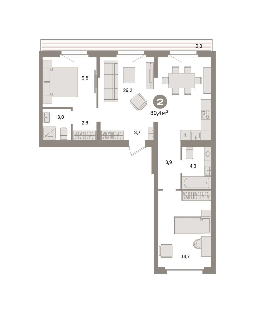 Квартира с кухней-гостиной и двумя спальнями в квартале «Депо». Особенности планировки: окна на две стороны, второй санузел, гардеробная, вид во двор, разнесённые спальни, предчистовая отделка, мастер-спальня, терраса на крыше.