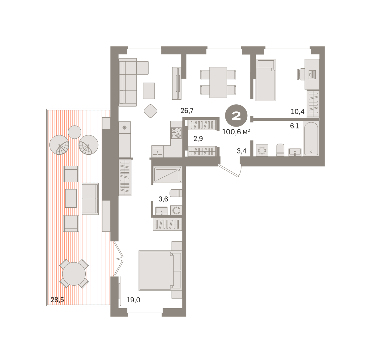 Квартира с кухней-гостиной и двумя спальнями в Бруснике в Академическом. Особенности планировки: гардеробная, вид во двор, разнесённые спальни, предчистовая отделка, мастер-спальня, терраса на крыше.