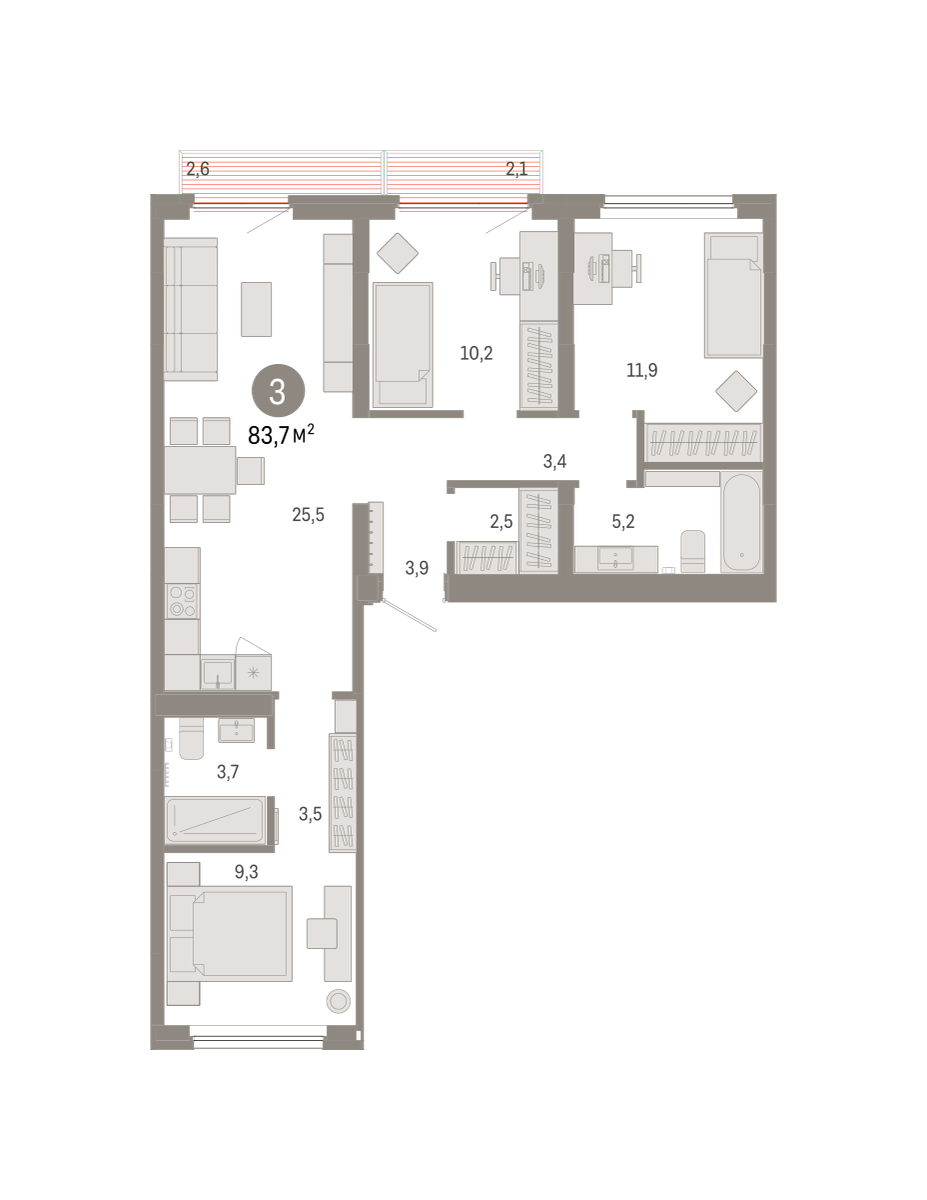 Квартира с кухней-гостиной и тремя спальнями в Бруснике в Академическом. Особенности планировки: второй санузел, гардеробная, вид во двор, разнесённые спальни, предчистовая отделка, мастер-спальня, балкон. № квартиры в нашей базе: АКД04-Ж7.7.1.