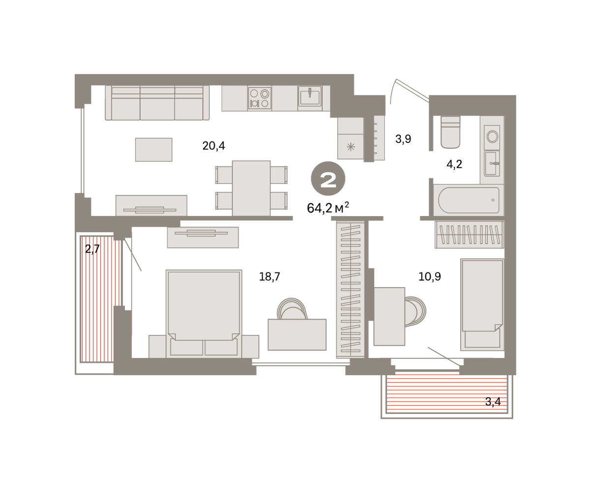 Квартира с кухней-гостиной и двумя спальнями в квартале «Депо». Особенности планировки: разнесённые спальни, предчистовая отделка, балкон. № квартиры в нашей базе: ДЕП04-Ж8.3.4.