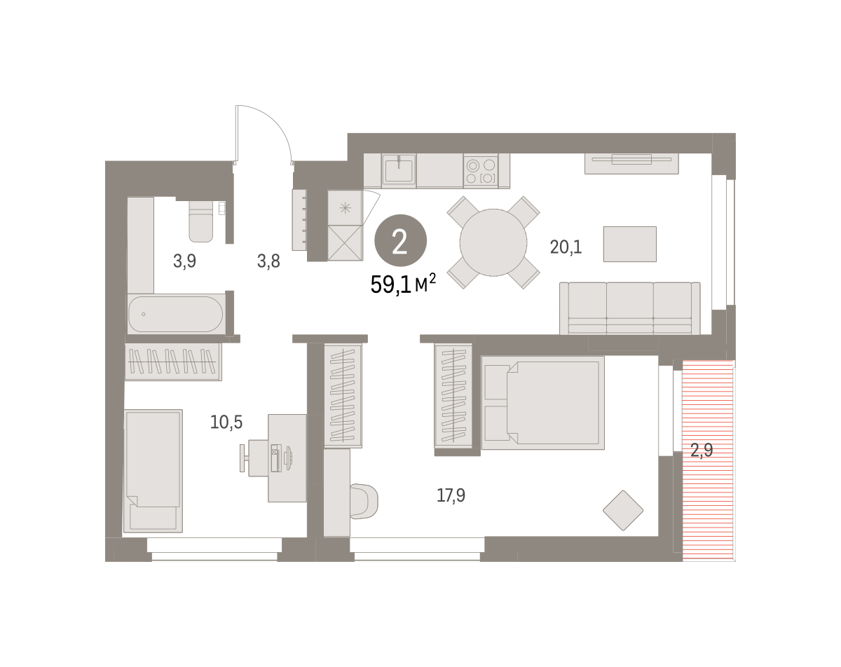 Продаётся с кладовой. Квартира с кухней-гостиной и двумя спальнями в Бруснике в Академическом. Особенности планировки: лоджия, разнесённые спальни, предчистовая отделка. № квартиры в нашей базе: АКД04-Ж2.2.5.