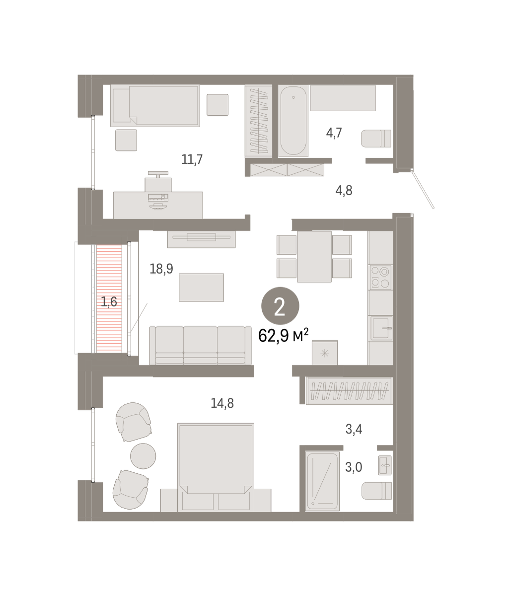 Квартира с кухней-гостиной и двумя спальнями в Южных кварталах. Особенности планировки: гардеробная, окна в пол, разнесённые спальни, предчистовая отделка, мастер-спальня, терраса.