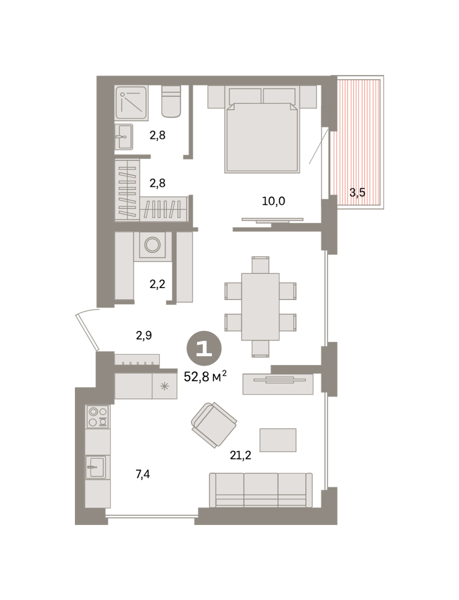Квартира с кухней-гостиной и одной спальней в квартале «Депо». Особенности планировки: гардеробная, предчистовая отделка, мастер-спальня, балкон. № квартиры в нашей базе: ДЕП07-Ж4.9.3.