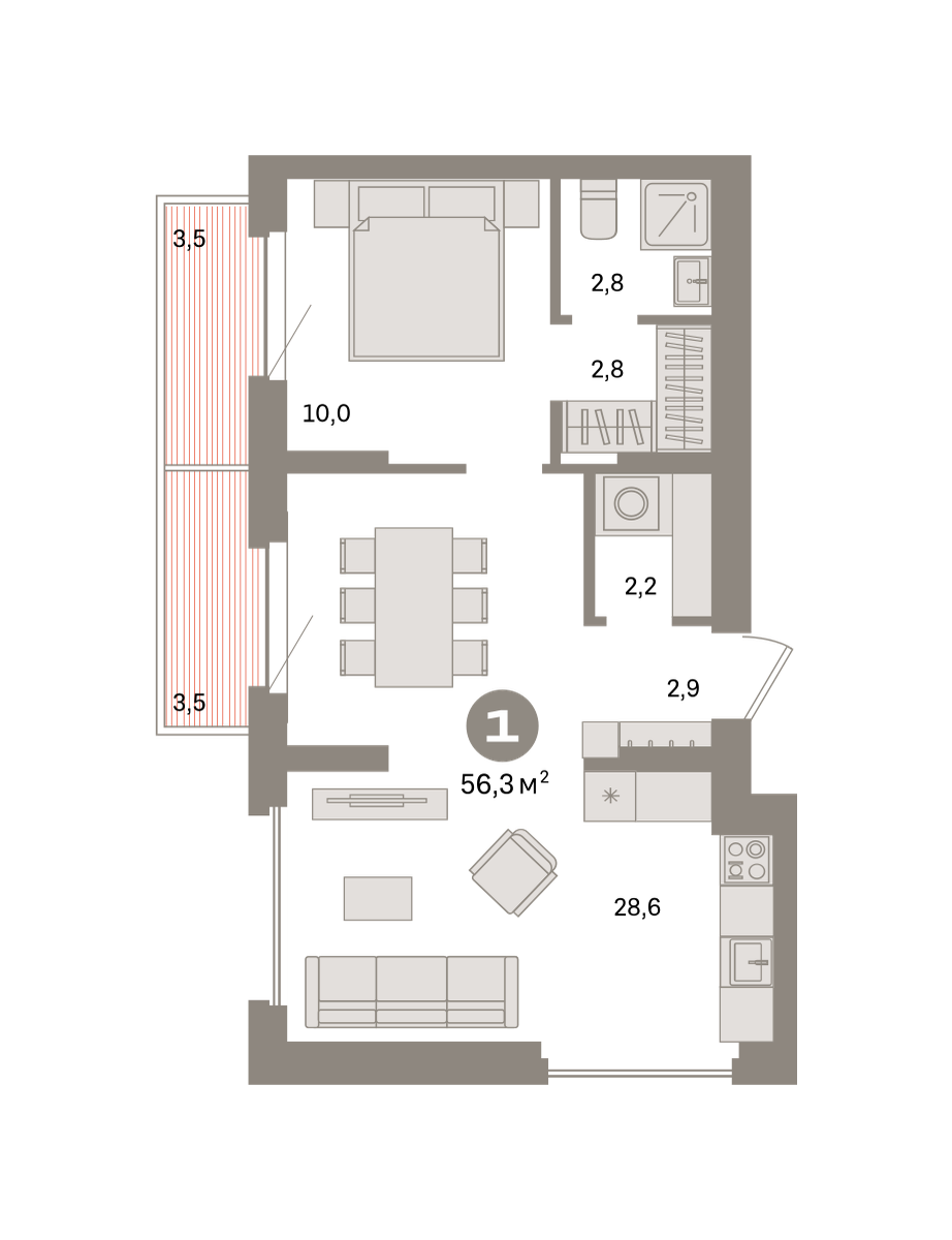 Квартира с кухней-гостиной и одной спальней в квартале «Депо». Особенности планировки: гардеробная, предчистовая отделка, мастер-спальня, балкон. № квартиры в нашей базе: ДЕП07-Ж6.9.4.