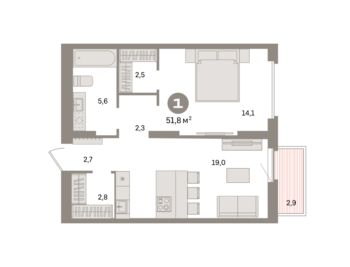 Квартира с кухней-гостиной и одной спальней в квартале «Депо». Особенности планировки: гардеробная, вид во двор, предчистовая отделка, балкон. № квартиры в нашей базе: ДЕП07-Ж1.6.1.