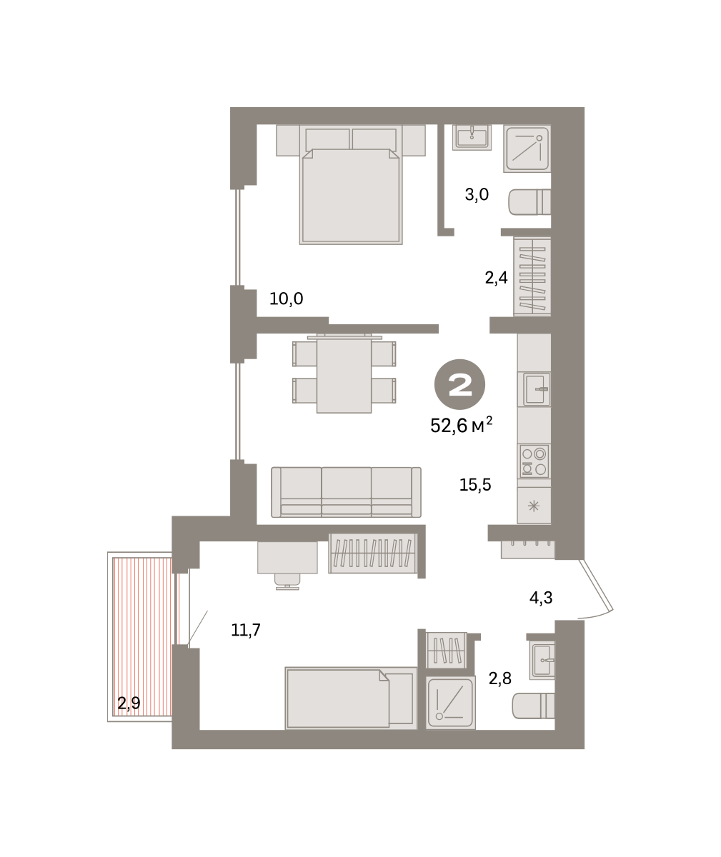 Квартира с кухней-гостиной и двумя спальнями в квартале «Депо». Особенности планировки: гардеробная, разнесённые спальни, предчистовая отделка, мастер-спальня, балкон. № квартиры в нашей базе: ДЕП07-Ж6.6.7.