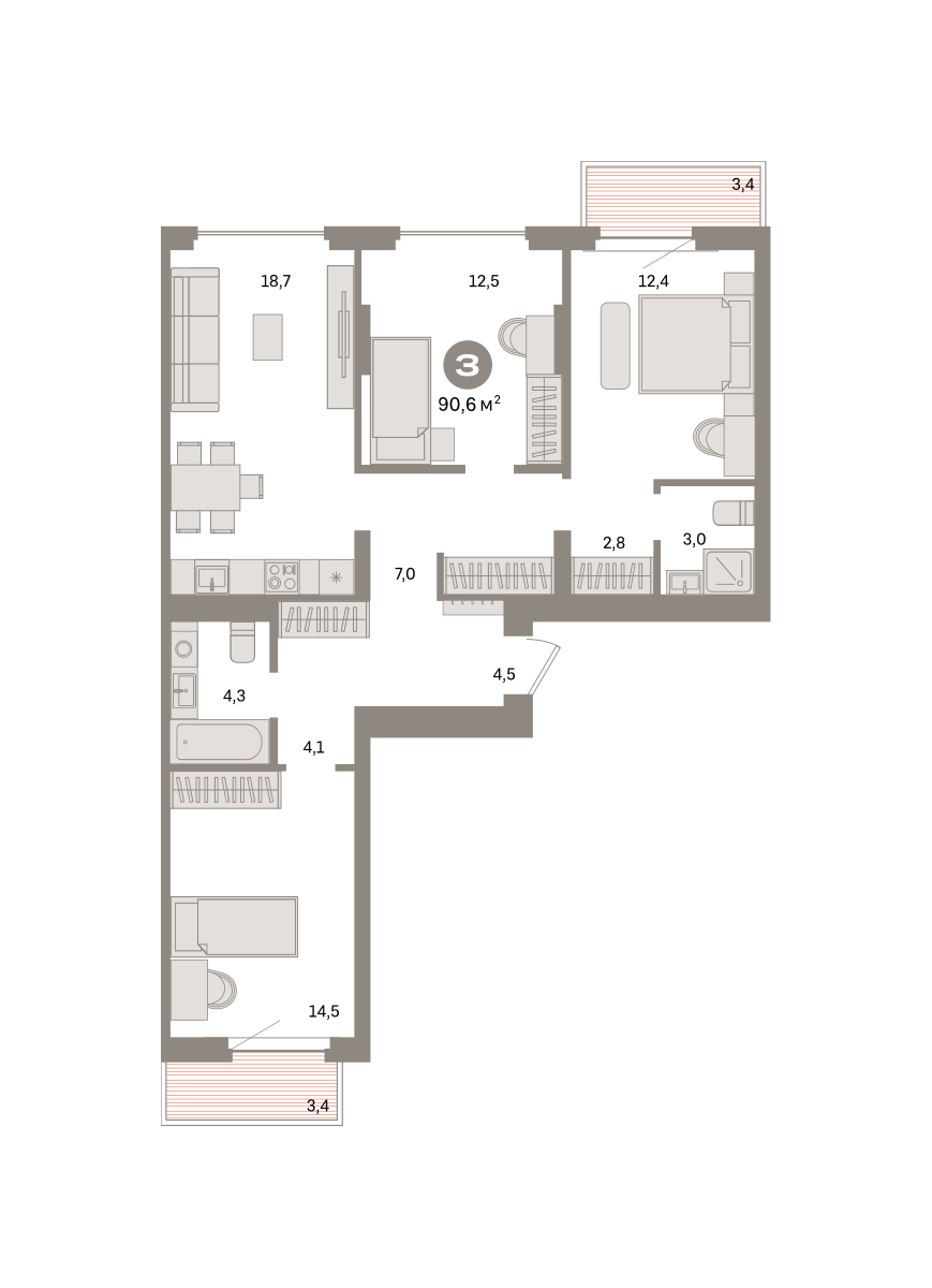 Квартира с кухней-гостиной и тремя спальнями в квартале «Депо». Особенности планировки: окна на две стороны, гардеробная, вид во двор, лоджия, разнесённые спальни, предчистовая отделка, мастер-спальня, балкон.