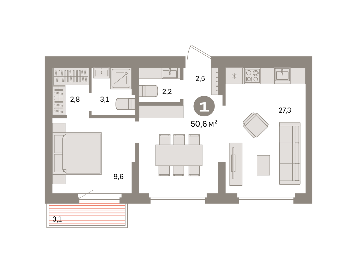 Квартира с кухней-гостиной и одной спальней в квартале «Депо». Особенности планировки: второй санузел, гардеробная, предчистовая отделка, мастер-спальня, балкон. № квартиры в нашей базе: ДЕП04-Ж6.9.2.