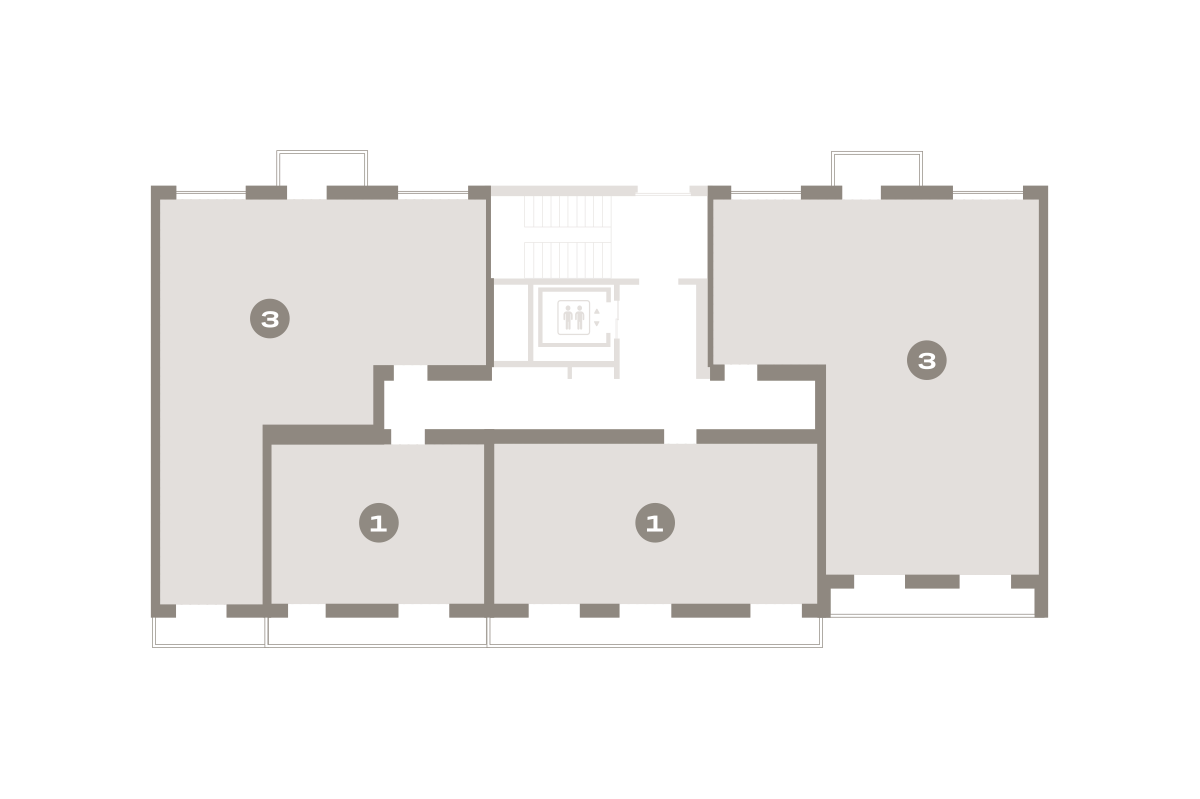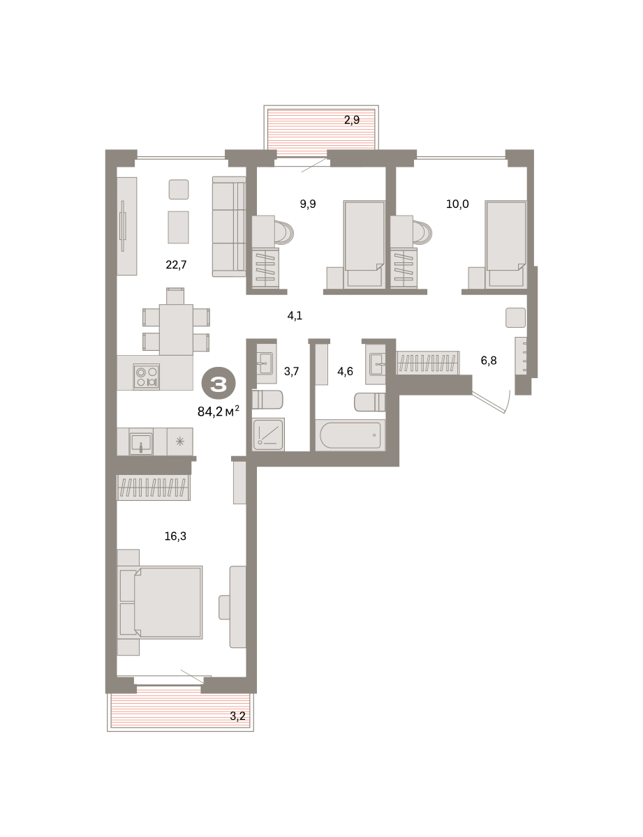 Квартира с кухней-гостиной и тремя спальнями в квартале «Депо». Особенности планировки: окна на две стороны, второй санузел, разнесённые спальни, предчистовая отделка, балкон, терраса на крыше.