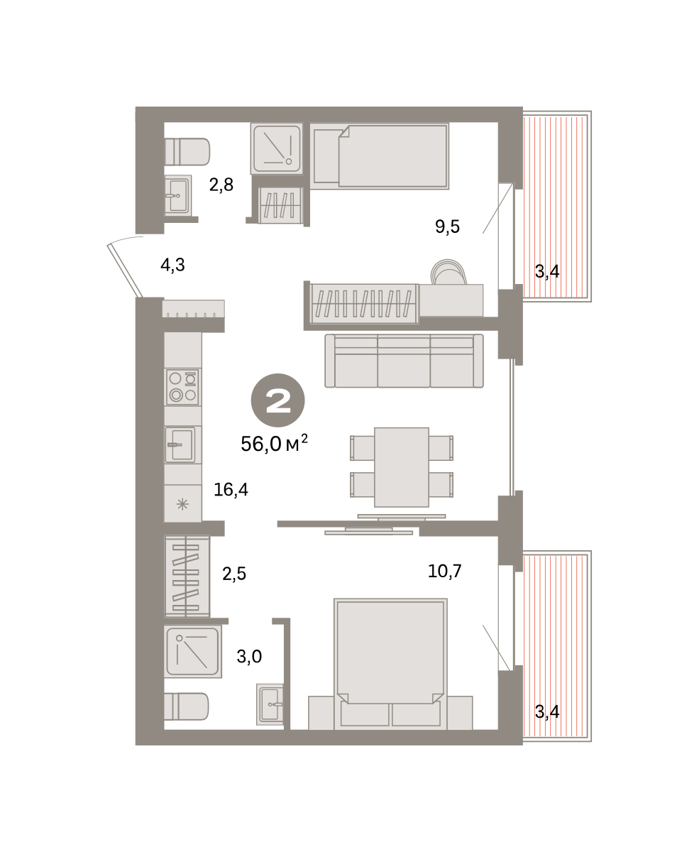 Квартира с кухней-гостиной и двумя спальнями в квартале «Депо». Особенности планировки: второй санузел, гардеробная, вид во двор, разнесённые спальни, предчистовая отделка, мастер-спальня, балкон.