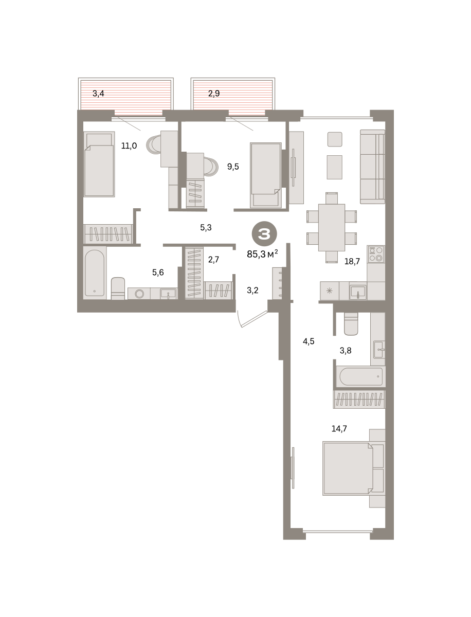 Продаётся с кладовой. Квартира с кухней-гостиной и тремя спальнями в квартале «Депо». Особенности планировки: балкон, окна на две стороны, предчистовая отделка, разнесённые спальни. № квартиры в нашей базе: ДЕП04-Ж3.4.3.