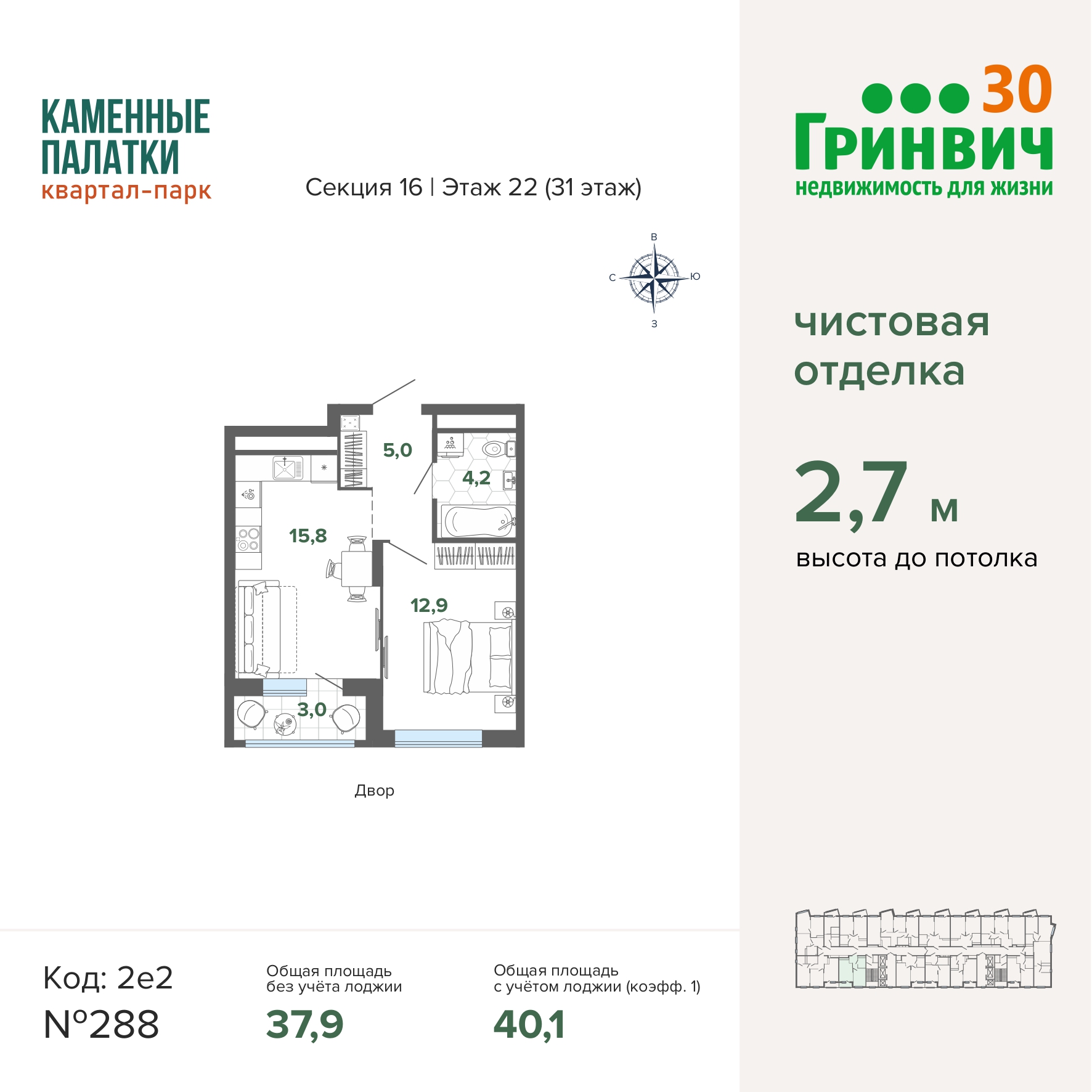 • Высокие потолки (2,7 м);
