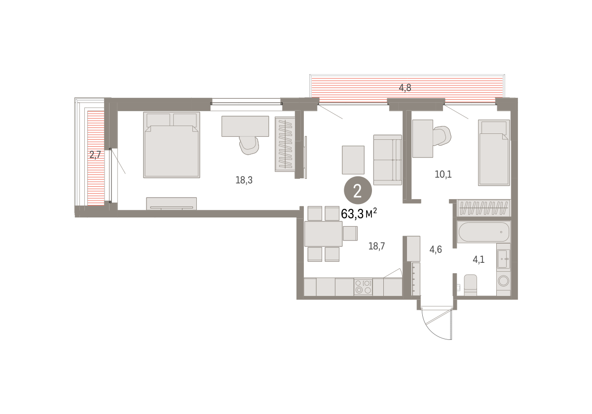 Продаётся с кладовой. Квартира с кухней-гостиной и двумя спальнями в Бруснике в Академическом. Особенности планировки: лоджия, разнесённые спальни, предчистовая отделка, балкон. № квартиры в нашей базе: АКД05-Ж1.7.8.