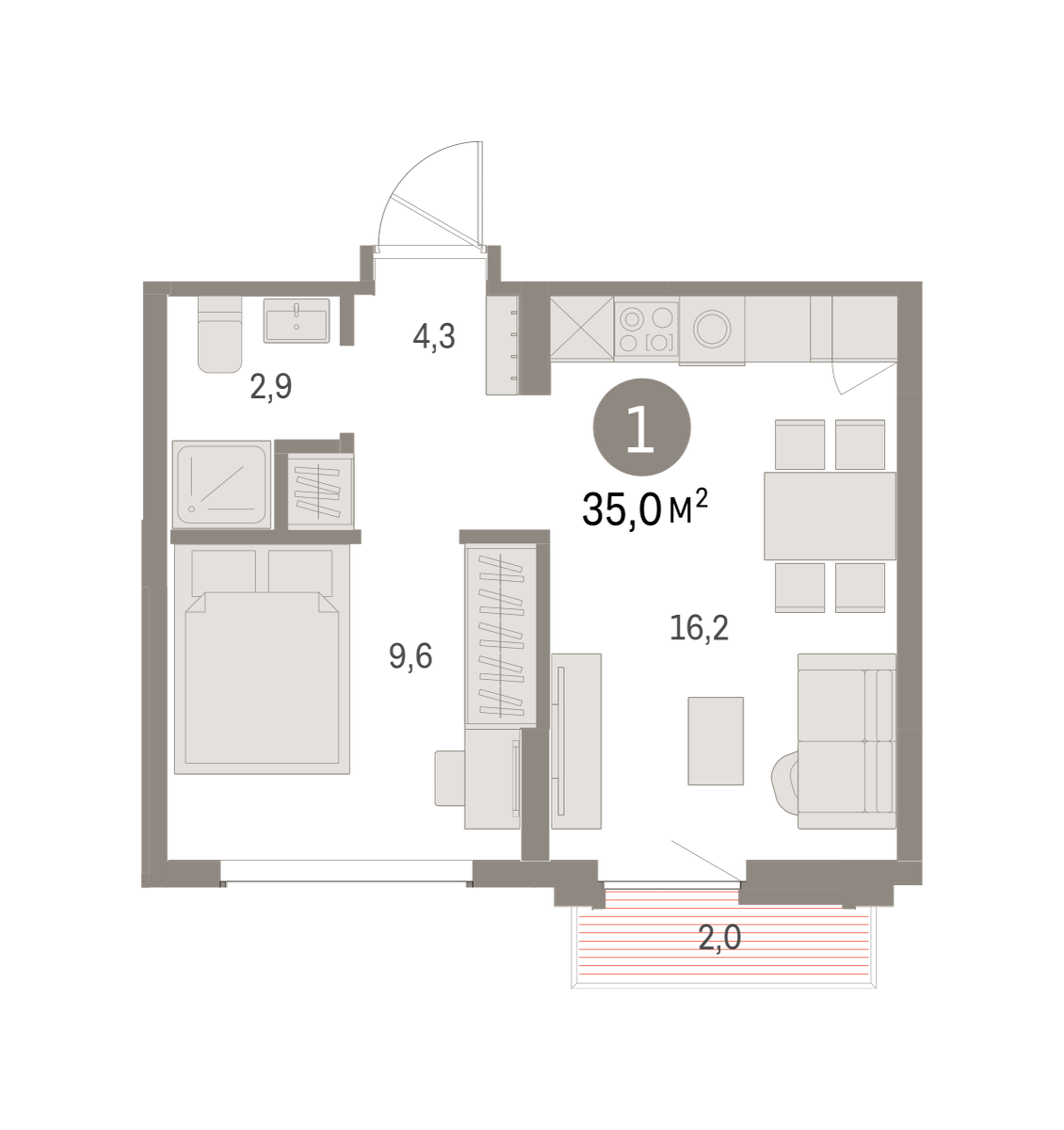 Квартира с кухней-гостиной и одной спальней в Бруснике в Академическом. Особенности планировки: вид во двор, предчистовая отделка, балкон. № квартиры в нашей базе: АКД05-Ж2.9.3.