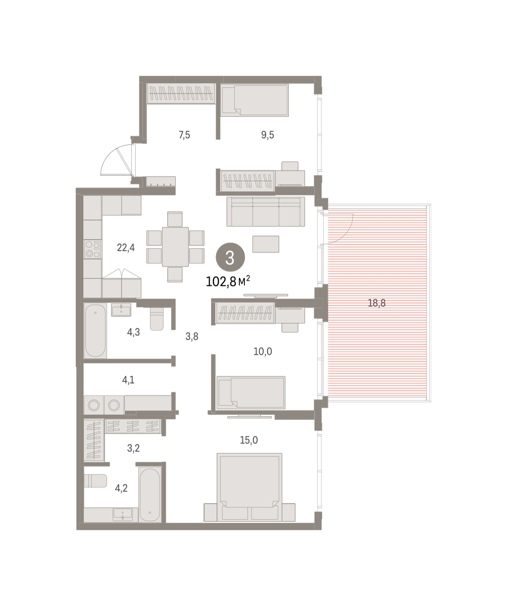 Квартира с кухней-гостиной и тремя спальнями в Бруснике в Академическом. Особенности планировки: гардеробная, окна в пол, вид во двор, панорамное остекление, разнесённые спальни, предчистовая отделка, мастер-спальня, терраса, постирочная.