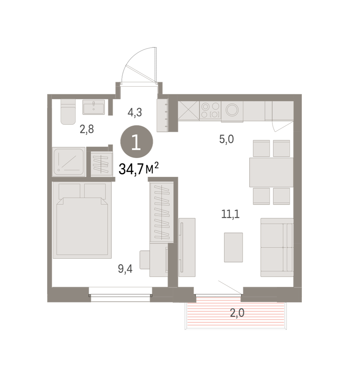 Квартира с кухней-гостиной и одной спальней в Бруснике в Академическом. Особенности планировки: вид во двор, предчистовая отделка, балкон. № квартиры в нашей базе: АКД05-Ж1.7.10.